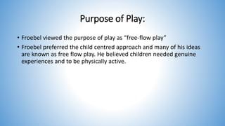 Friedrich Froebel was a German educator who founded kindergarten and developed theories about the importance of play in children's development. He believed play should involve genuine experiences, physical activity, and engagement with materials in nature. Froebel created gifts and occupations to introduce children to physical forms through play and established the first kindergarten, influencing current early childhood practices like songs, games, and outdoor play that develop children holistically.
