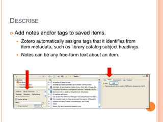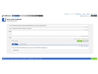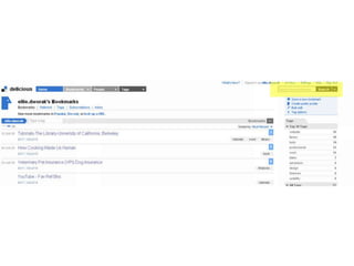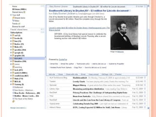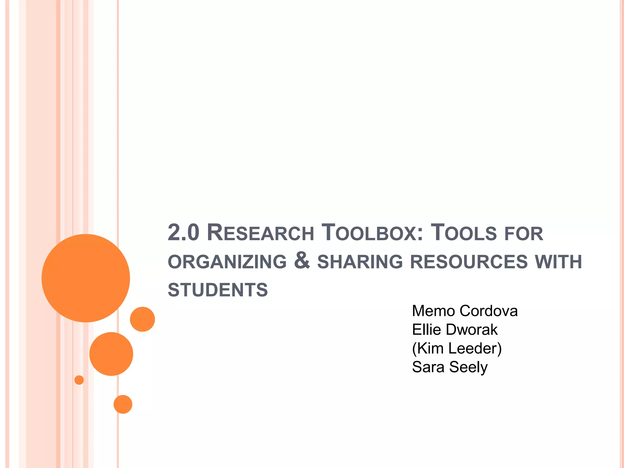This document summarizes several research tools that can be used to organize and share resources with students. It discusses RSS feeds, social bookmarking tools like Delicious, citation managers like Zotero, and screen capturing tools like Jing. For each tool, it provides a brief overview of how it works and examples of how it could be used in a library setting. It encourages the reader to think about how these tools may help them in their work and to discuss their ideas with a partner.