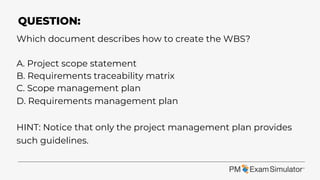The document is a summary of a CAPM exam sample and notes that it is not endorsed by PMI. It specifies that the correct answer for creating a Work Breakdown Structure (WBS) is found in the Scope Management Plan, which is part of the project management plan. Additionally, it mentions that all questions are updated to the latest PMBOK® guide standard.