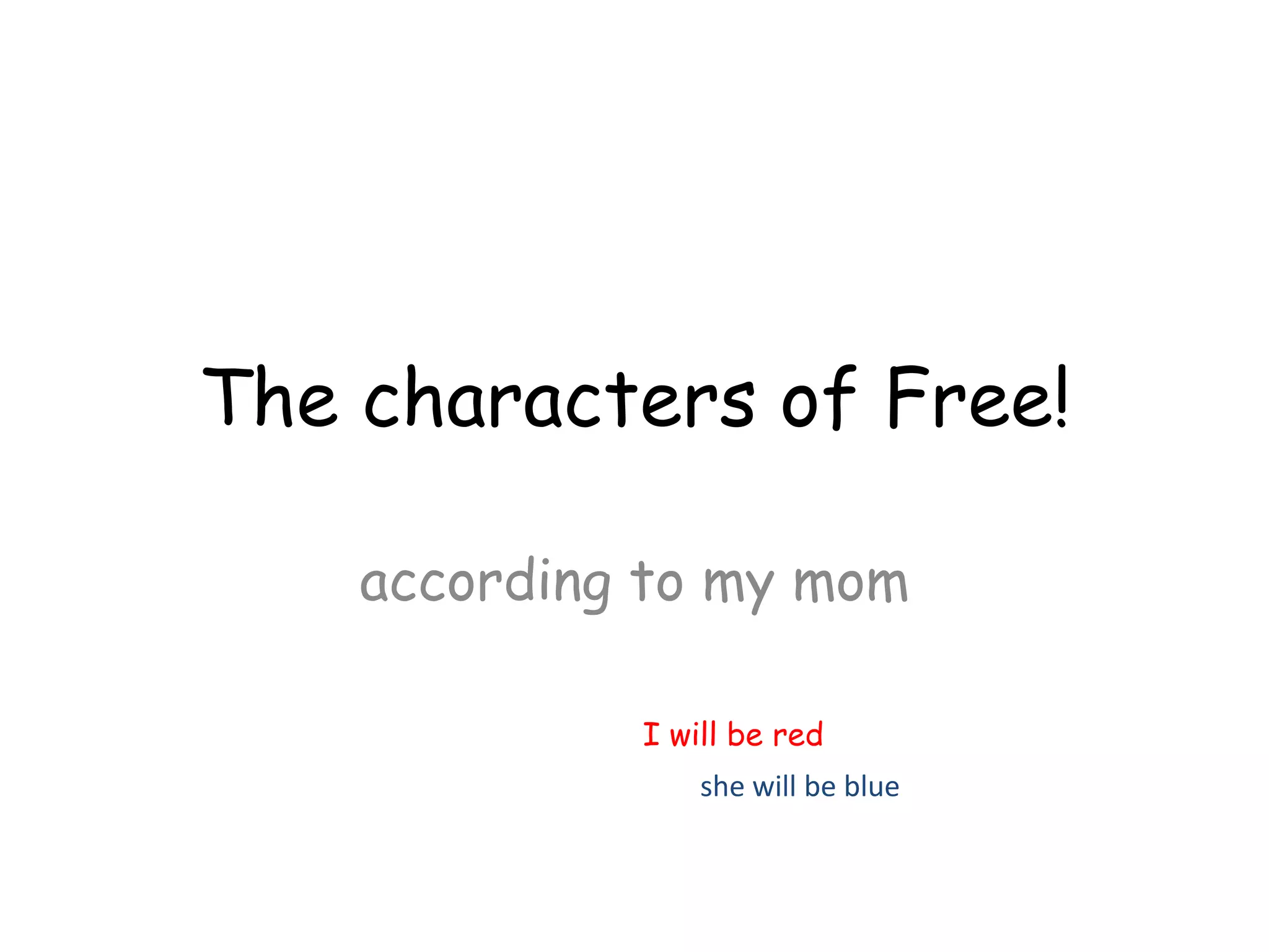 The document discusses characters from the anime Free! and assigns them stereotypical labels like "gay" or attributes like "wet" and "built". When asked to provide more profound analysis, the responder sighs and suggests a female character wishes the male characters "weren't gay" and that she is possessed by spirits.