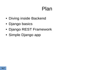 The document discusses Django, a Python web framework. It covers diving into backend architecture, Django basics including project structure and MVC patterns, the Django REST framework for APIs, and steps to create a simple Django app including installing Python/pip and Django then running the development server.