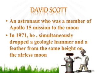 The document discusses free fall and Galileo's experiments proving that all objects fall at the same rate regardless of their mass if air resistance is neglected. It notes that Galileo timed metal balls rolling down an inclined plane with a water clock to measure their speed of falling. The key equations for free fall acceleration due to gravity (g = -9.8 m/s^2) and relationships between displacement, time, initial velocity, and final velocity are also presented.