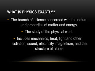 This document discusses the physics of falling objects. It defines physics as the study of matter, energy, and their interactions. It states that near the Earth's surface, in the absence of friction, all objects experience a constant downward acceleration due to gravity of about 9.81 m/s2. It provides the kinematic equations for analyzing vertical motion under constant acceleration due to gravity and emphasizes the importance of sign conventions in such problems. Finally, it works through an example problem of calculating the distance fallen by a ball dropped from a tower over different time intervals.