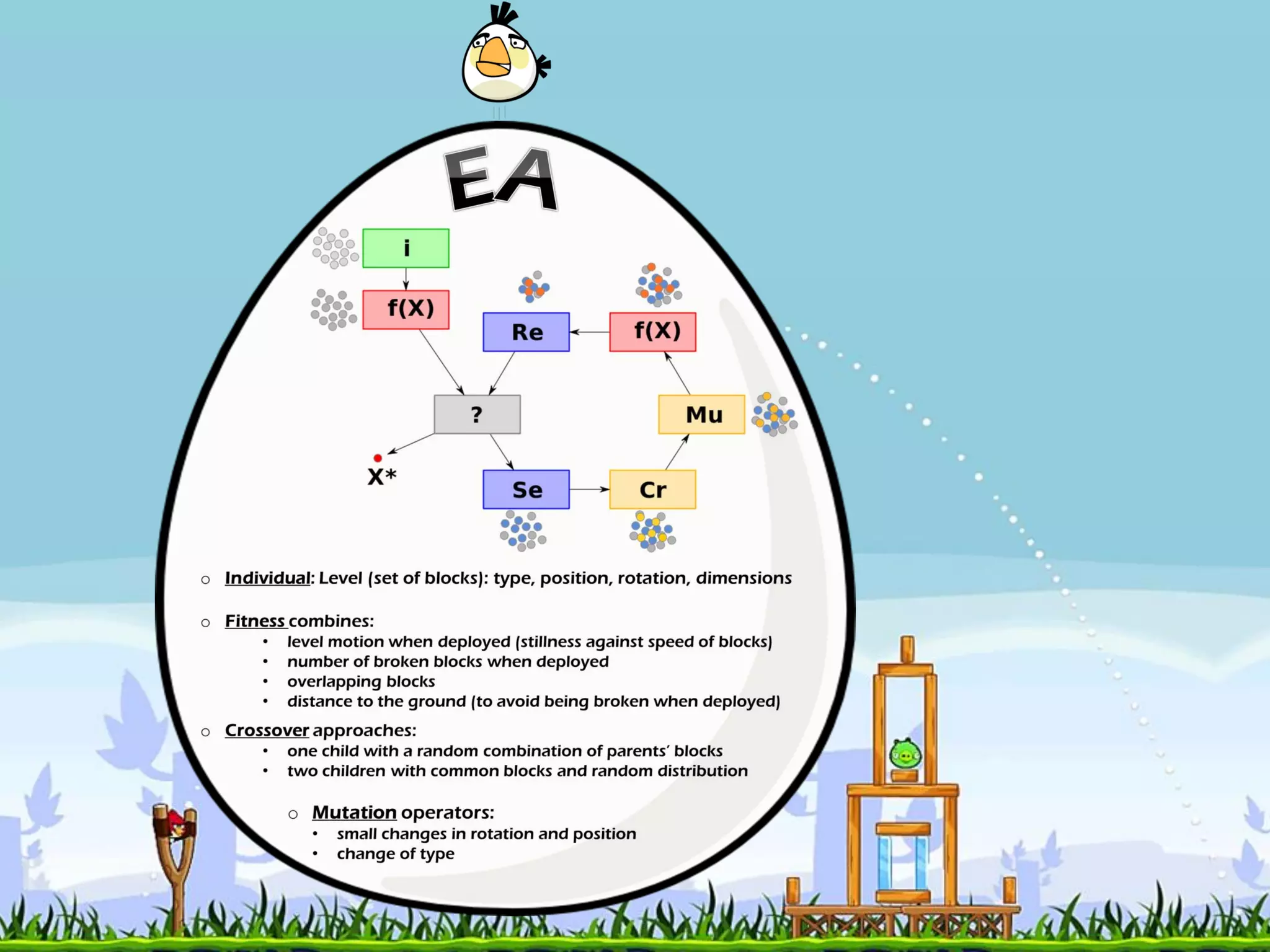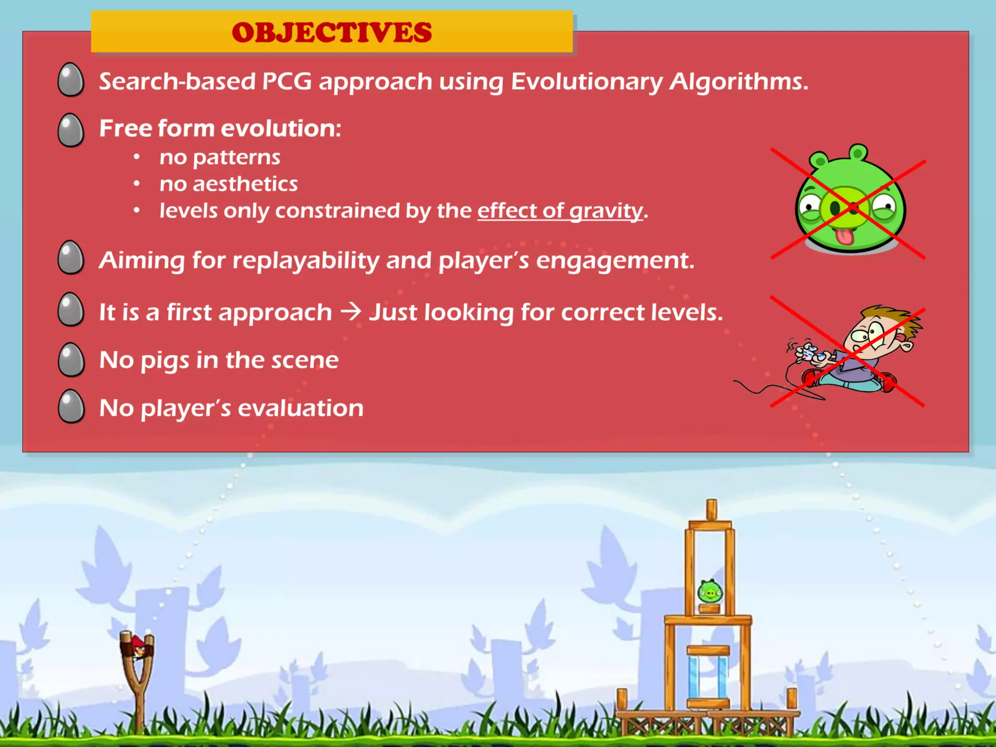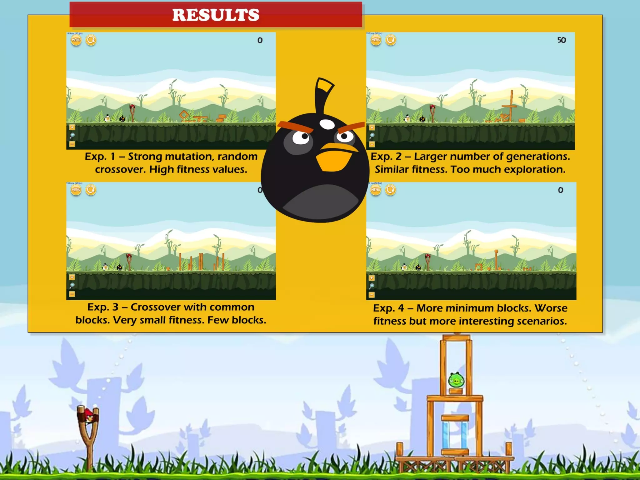 An adapted version of 'science birds' was implemented to gather more information, focusing on creating stable structures for Angry Birds. The current fitness function needs improvement as it does not account for several important factors, and the scenarios lack excitement and visual appeal. Suggestions include redefining the fitness function to consider aesthetics and height, as well as using operators for stable structure enhancement.