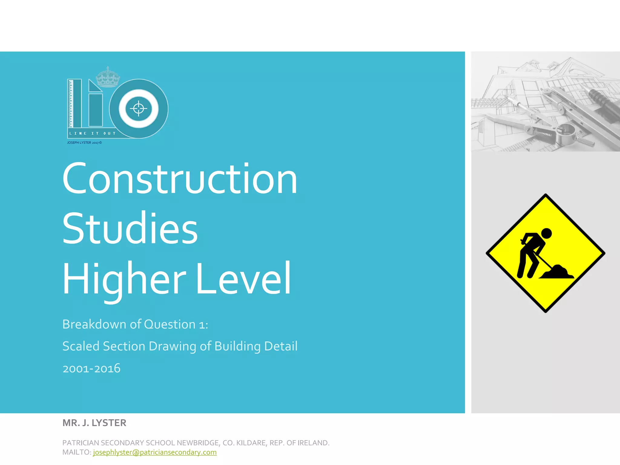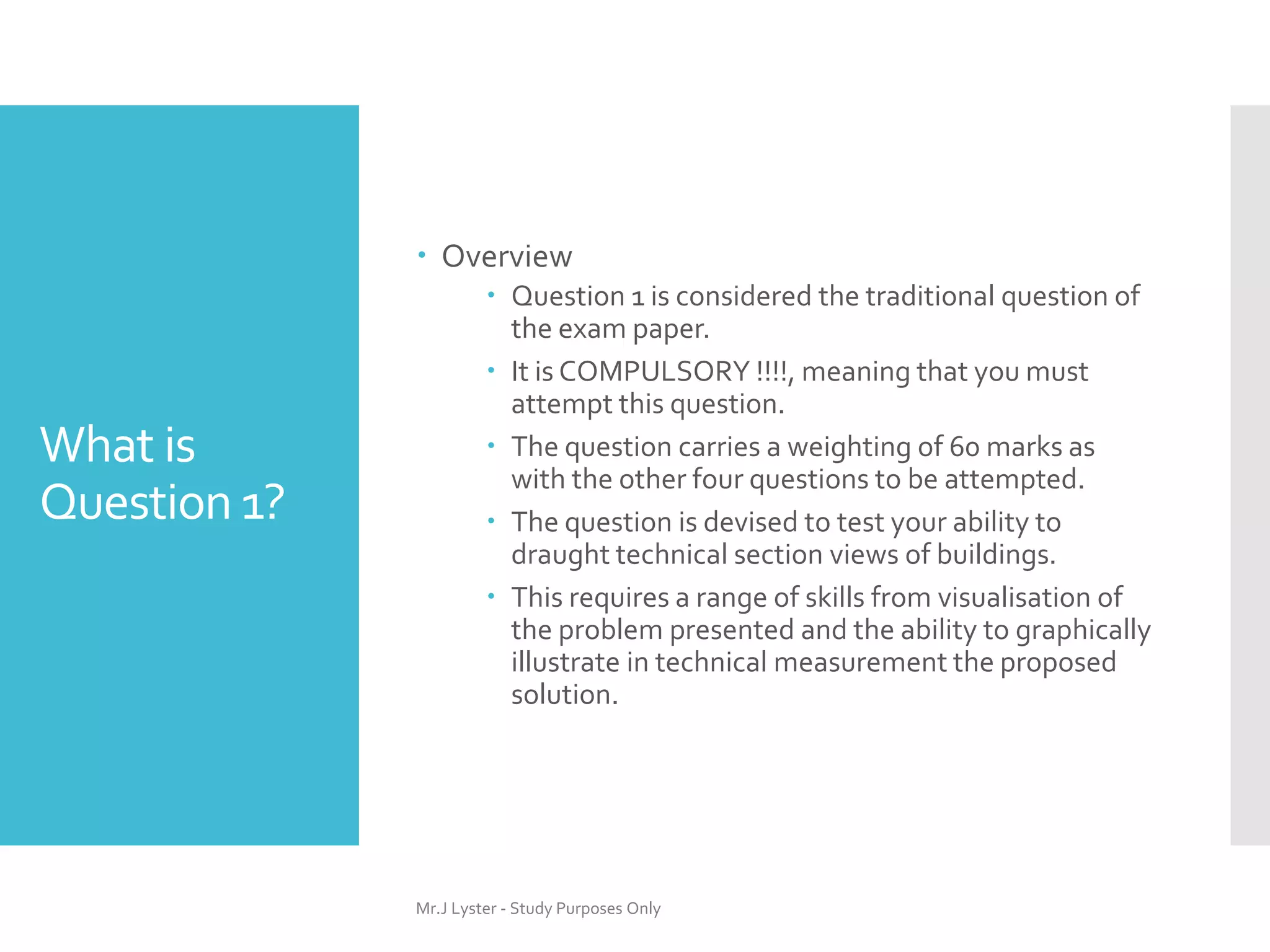 Question 1 of the construction studies exam is mandatory and carries 60 marks, designed to assess students' ability to create technical section views of buildings. It covers various topics requiring detailed drawings and scale representation, with emphasis on accuracy and clarity to avoid losing significant marks. Students should familiarize themselves with different building details such as foundations, wall details, and various other structural components to succeed.