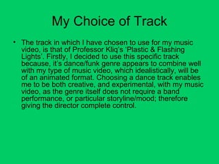 The document discusses the choice of track for a music video. The track chosen is "Plastic & Flashing Lights" by Professor Kliq. Professor Kliq's dance/funk genre was selected because it would combine well with an animated video format. The youthful and abstract sound of Professor Kliq's music also makes it a suitable fit. Professor Kliq is an established artist with several well-received mixtapes, indicating a high quality of music.