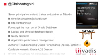 The document discusses various free load testing tools for Oracle databases, highlighting Swingbench, SLOB, and Apache JMeter. It provides insights into their capabilities, use cases, and comparative advantages, helping users select the appropriate tool for specific testing needs. The key takeaway is that no single tool meets all requirements, but Swingbench and SLOB are effective for certain tasks while JMeter offers more flexibility with a DIY approach.