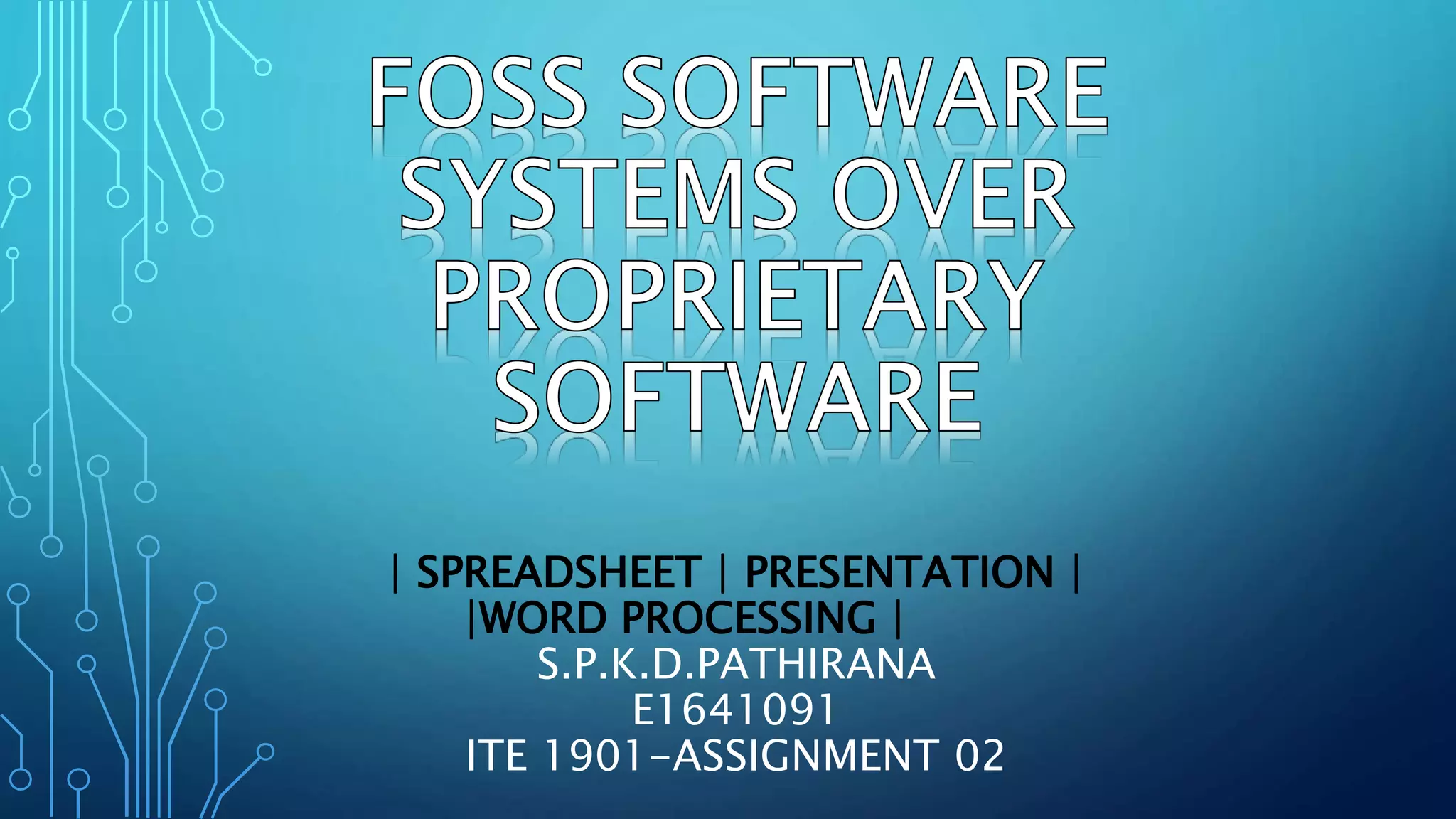 This document discusses different types of office software programs including spreadsheets, word processors, and presentation programs. It provides definitions and examples of each type of program. Key features of spreadsheets include visual design, automatic calculations, dynamic updates, and data analysis. Core features of word processors are text formatting, multimedia capabilities, spelling and grammar checks, and layout adjustments. Central features of presentation programs are ready templates, animation effects, slide customization, and animation/sound manipulation. The document also compares free and open source software versus proprietary software, noting advantages and disadvantages of each.