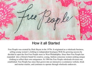 Free People began in the 1970s as a wholesale business selling women's clothing. The founder Dick Hayne opened the first Free People store in West Philadelphia in the 1970s. Since then, Free People has expanded into a lifestyle brand and retailer selling clothing, accessories, and home goods reflecting a bohemian aesthetic. While starting as a wholesale business, Free People now operates brick-and-mortar stores, an e-commerce site, and continues wholesale. The brand targets creative, young women through unique merchandise and an inviting store environment. Free People uses social media and an interactive website to engage customers and promote their constantly evolving product mix.