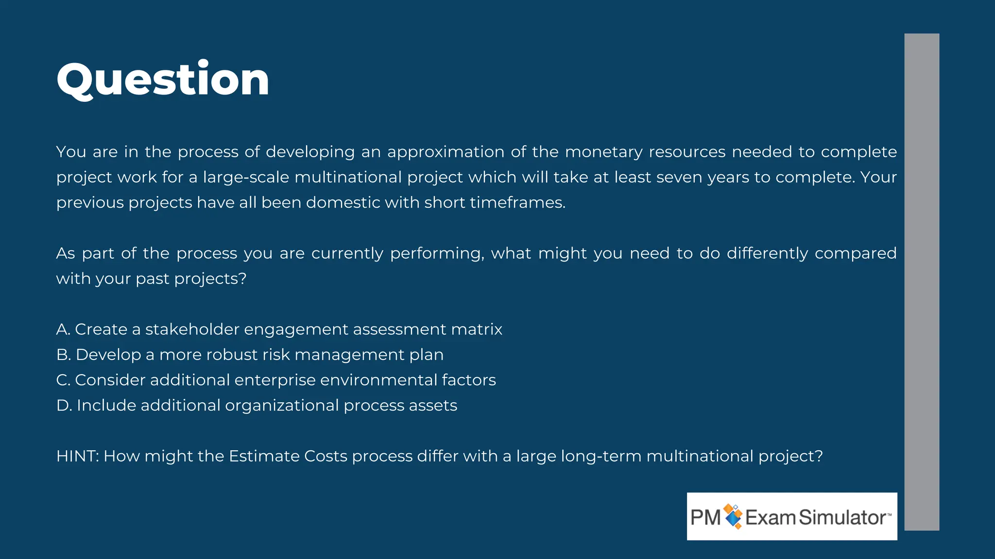 HINT: How might the Estimate Costs process differ with a large long-term multinational project?
