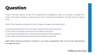 The document presents a question about a project manager's review of a requirements management plan, highlighting the exclusion of a process that specifies how a project scope statement will be prepared. This component is identified with the correct answer being 'c,' as it should belong to the scope management plan instead. The content adheres to the latest PMBOK® Guide standards and offers access to a free PM exam simulator.