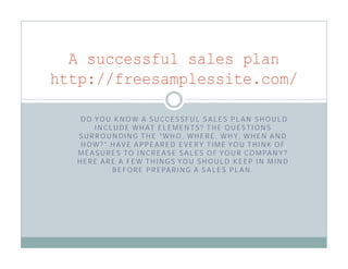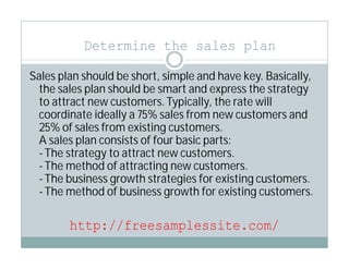 A successful sales plan should include strategies for attracting new customers and growing existing customers. It should determine quotas for attracting new customers through letters, phone calls, meetings, and proposals. It also needs strategies for increasing awareness of products/services through professional associations, trade shows, social media, and local community organizations. Collecting referrals from new customers is also an important part of the sales plan.