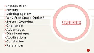 This document provides an overview of free space optical communication (FSO). It begins with an introduction that defines FSO as the transmission of visible and infrared beams through the atmosphere to achieve optical communications. It then discusses the history and existing fiber optic systems. The document outlines the advantages of FSO such as low cost, high security, and rapid deployment. It also discusses challenges like weather effects and limitations in range. Applications mentioned include enterprise connectivity, military/government use, and disaster management. The conclusion states that FSO provides a promising supplemental technology to wireless and fiber optic networks.