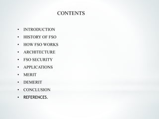 This document provides an overview of free space optics communication (FSO). It begins with an introduction that defines FSO as using visible or infrared light beams through the atmosphere for optical communications. It then describes how FSO works using low power infrared lasers and photon detectors. The document outlines the basic architecture of FSO systems including transmitters, receivers, and modulation techniques. It discusses applications, advantages such as low cost and flexibility, and disadvantages like interference from weather. In conclusion, the document presents FSO as a wireless optical technology alternative to traditional wired networks.