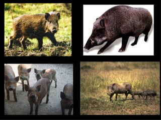 The document provides information about pigs including the wild boar, domestic pig, and warthog. It discusses: