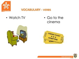 The document lists various free time activities and includes vocabulary verbs related to hobbies and leisure activities. It also provides information about simple present tense grammar, including short questions using auxiliary verbs like "do" and "does", short answers to affirmative and negative questions, and examples of WH- questions using auxiliary verbs.