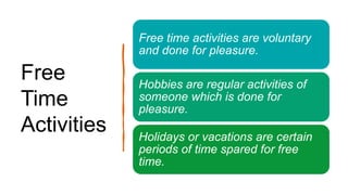 This document discusses free time activities and defines them as voluntary activities done for pleasure. It notes that hobbies are regular activities done in one's leisure time, and holidays or vacations are periods of time set aside for free time pursuits. A list of example free time activities is then provided, including playing with a frisbee or dog, going to the cinema, museum, park, library, zoo, amusement park, or going for a walk, shopping, fishing, swimming, camping, or to a party.