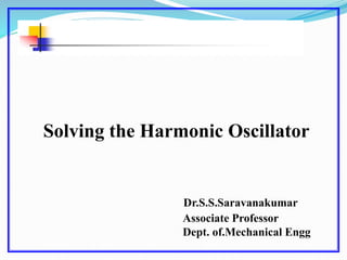 This document discusses solving the harmonic oscillator equation. It covers undamped and damped free vibrations as well as forced vibrations. For free vibrations, it examines the general solution and particular solutions. It also discusses topics like natural frequency, damping, and resonance. The document suggests modeling a vibrating beam as a harmonic oscillator and rewriting the equation as a first order system for numerical solving in Matlab. Lastly, it notes that the solution depends on ratios of m, c, and k rather than their individual values, which is important for solving the inverse problem.