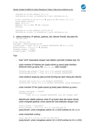 Dokumen ini menjelaskan langkah-langkah standar untuk menginstal dan mengonfigurasi FreeBSD di Institut Manajemen Telkom, termasuk pengaturan alamat IP, gateway, DNS, hostname, dan firewall. Selain itu, dijelaskan juga cara menetapkan aturan firewall dasar dan pengaturan akses host yang diperbolehkan. Konfigurasi sistem lebih lanjut mencakup pengaturan variabel sistem untuk meningkatkan kinerja jaringan dan server.
