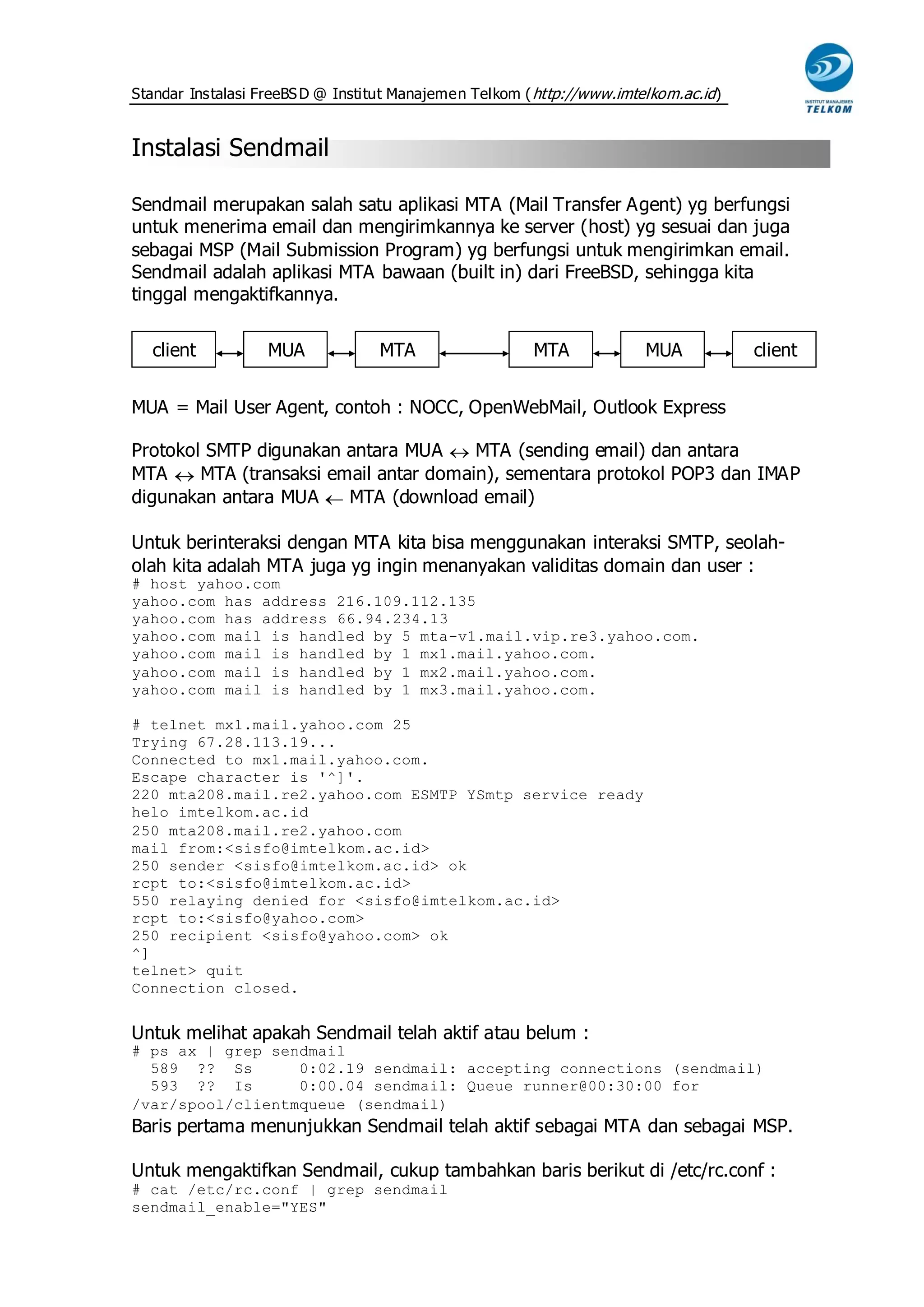 Dokumen ini menjelaskan proses instalasi dan konfigurasi aplikasi Sendmail pada sistem FreeBSD di Institut Manajemen Telkom, termasuk pengaturan file konfigurasi yang diperlukan untuk mengoptimalkan pengiriman dan penerimaan email. Informasi mengenai pengaturan DNS dan pemecahan masalah juga disertakan untuk memastikan fungsionalitas yang benar dari server email. Selain itu, terdapat langkah-langkah untuk menginstal dan mengkonfigurasi SSMTP bagi server yang hanya berfungsi sebagai pengirim email.
