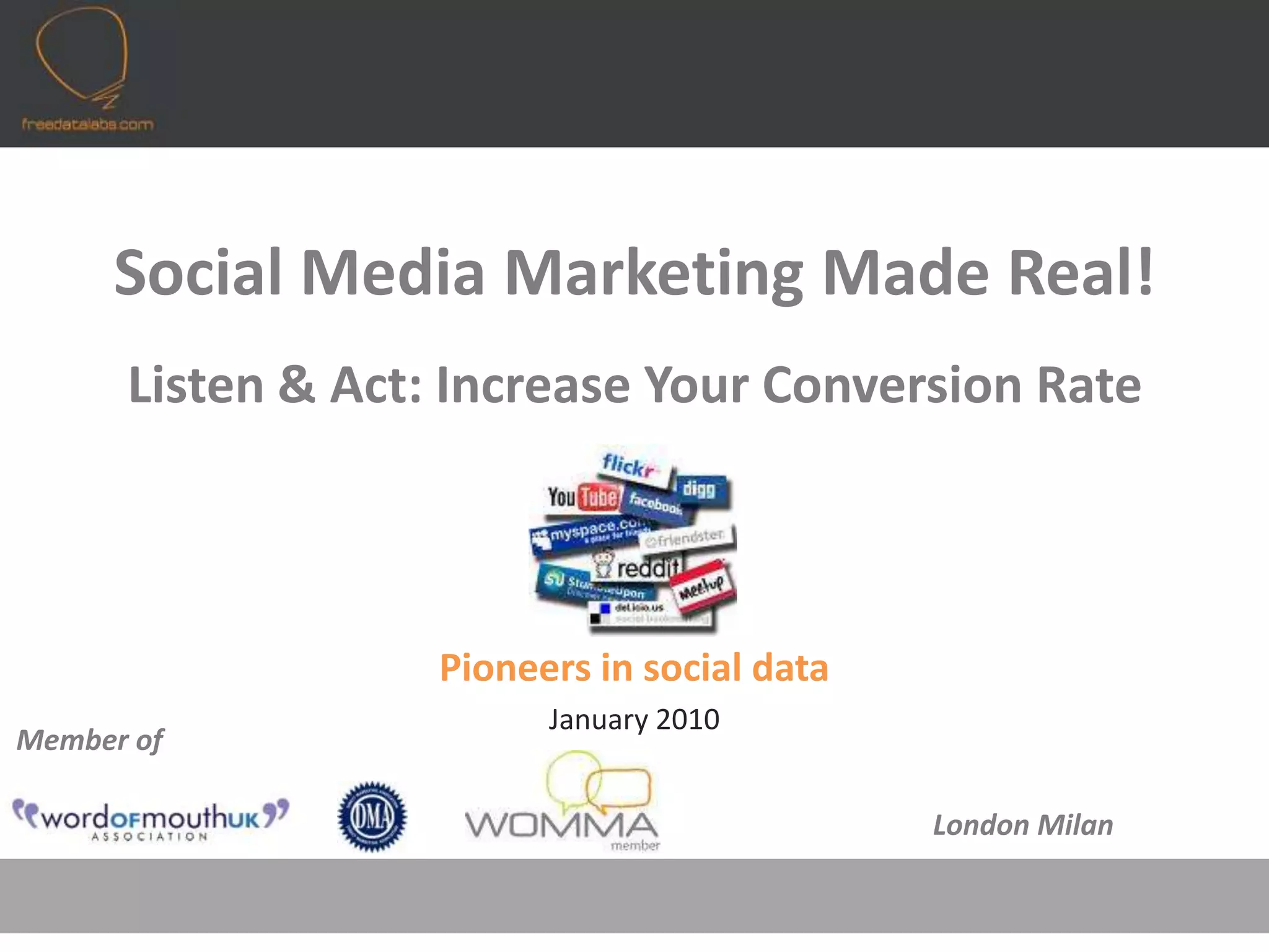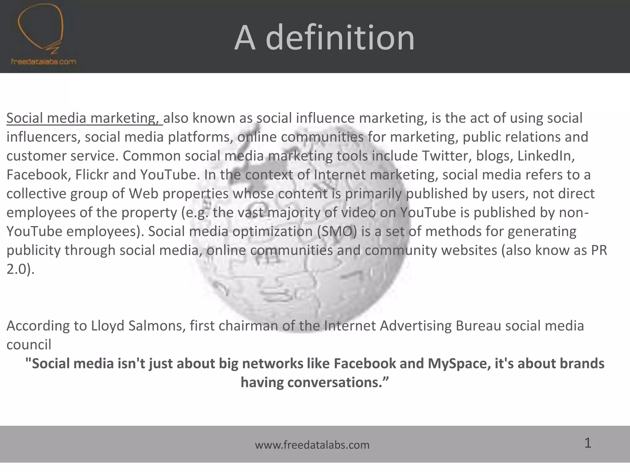 Social media marketing utilizes social media platforms and online communities to market, promote, and provide customer service. This document discusses how social media marketing works, the key social media channels used, and provides strategies for companies to listen to online conversations and seed relevant information through social interactions to increase brand awareness and conversion rates. It also introduces Freedata Labs, a company that provides social media marketing services including web monitoring, social media optimization, and seeding conversations online.