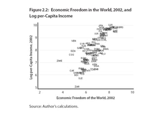 This document discusses development and freedom. It notes that development paths are unpredictable and different policies have led to different outcomes in different countries. There is no consensus on how to achieve development. The document argues that when there is no agreement on policies, freedom is the best approach by allowing individuals to determine their own paths. It discusses Hayek's views on how individual freedom and interaction leads to growth. The document advocates for political, economic and individual freedoms as well as freedom from foreign control as the best approach when development strategies are uncertain.