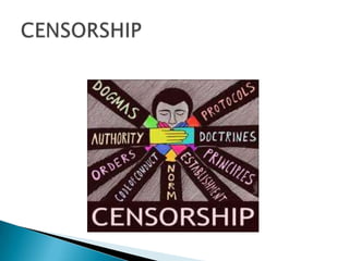 The document discusses censorship and its effects on freedom of the press. It provides definitions of censorship and its different types such as corporate, military, moral, religious, and political censorship. The document also discusses how political affiliations within media can influence the type of news and perspective presented, compromising impartiality and objectivity. Media laws and PEMRA, Pakistan's media regulatory authority, are also mentioned in regards to regulating broadcasting and ensuring satisfactory service.