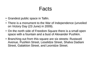 Freedom Square is the largest public square in Tbilisi, Georgia, home to a monument commemorating the country's War of Independence. Located at the intersection of six major streets, the square was originally named after an imperial Russian general but has held various names over time, reflecting Georgia's changing political climate. Important both for demonstrations and celebrations, Freedom Square was the site of a famous bank robbery in 1907 and more recently hosted large crowds for independence movements as well as a speech by the U.S. President where an assassination attempt occurred via grenade.