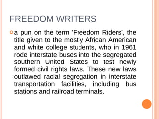 The document discusses the Freedom Writers Diary, which contains journal entries from students taught by Erin Gruwell. Gruwell incorporated her students' powerful diary entries into a book to share their experiences growing up in a violent, segregated community. The entries describe the students' experiences with gang violence, racism by police, and feelings of fear, loneliness, and the need to protect their own communities and families.