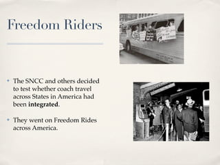 The document discusses the Freedom Riders and sit-ins during the 1960s Civil Rights Movement. The Freedom Riders tested segregation in interstate bus travel by riding buses through the South. They faced resistance. Sit-ins involved students peacefully protesting segregation at lunch counters through non-violent demonstrations, which also faced resistance in the South. Both protests helped raise awareness of racial inequality and persuaded some whites and the government that reforms were needed.