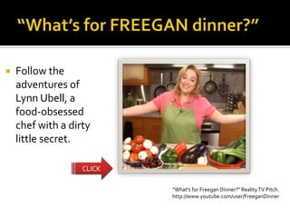The document discusses freeganism, which is a philosophy that boycotts the economic system by reclaiming discarded food and goods. It introduces Lynn Ubell, a chef with a reality TV show pitch about freegan dinners. Freeganism promotes waste minimization, eco-friendly transportation, rent-free housing, and working less to become self-sufficient rather than relying on bosses. Several video resources are provided on how to get started with freegan strategies like dumpster diving.