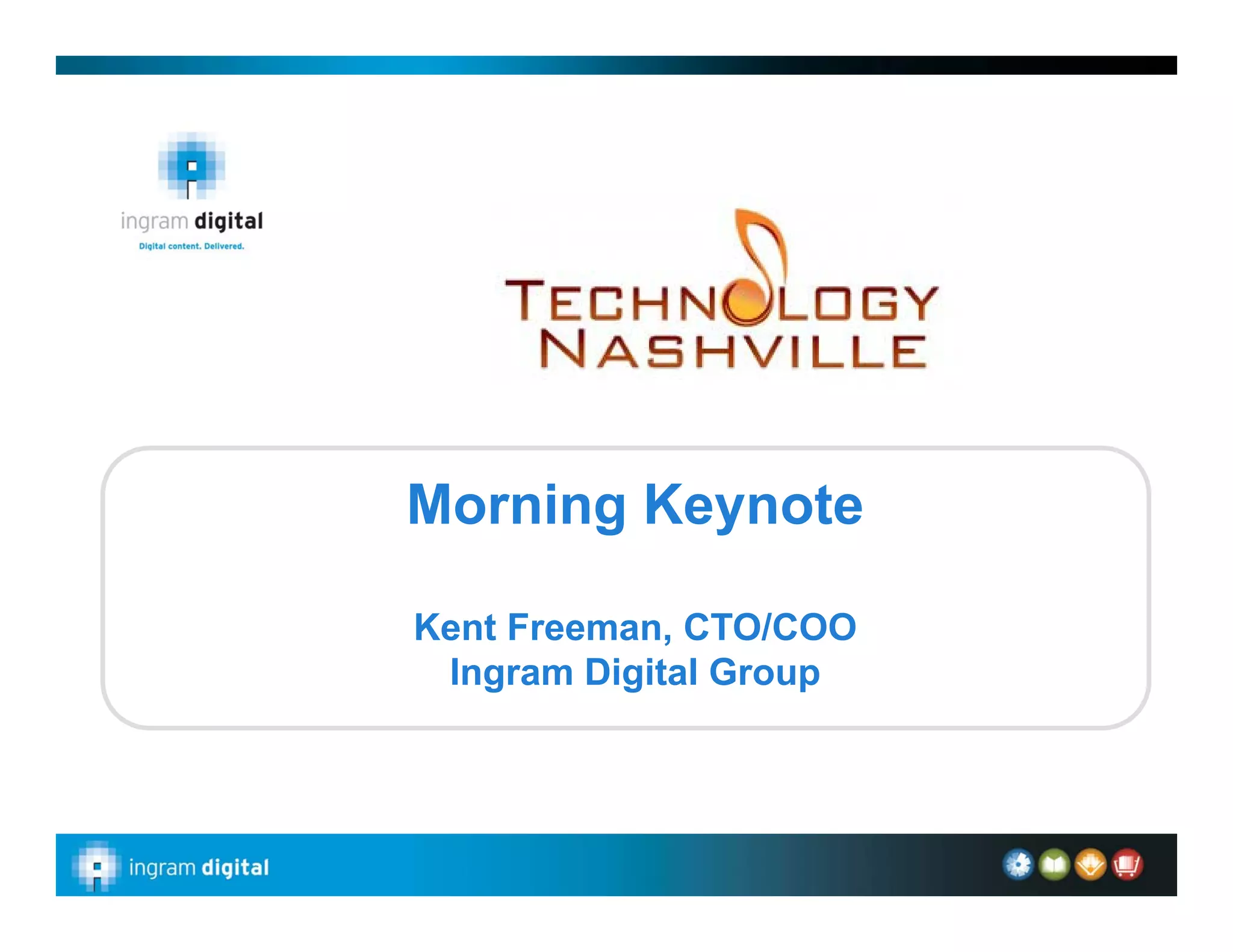 Kent Freeman, CTO/COO of Ingram Digital Group, gave the morning keynote. He discussed Ingram Industries, which includes transportation, book wholesale/distribution, and e-content storage companies. He provided a history of Ingram dating back to 1857 and milestones such as acquiring companies to form Ingram Micro. Freeman then discussed Ingram Digital's offerings like print-on-demand, e-book fulfillment, and digital content platforms for libraries, retailers, and education. He emphasized that print and digital content can co-exist and explained their strategies and services to address new marketplace dynamics in the publishing industry.