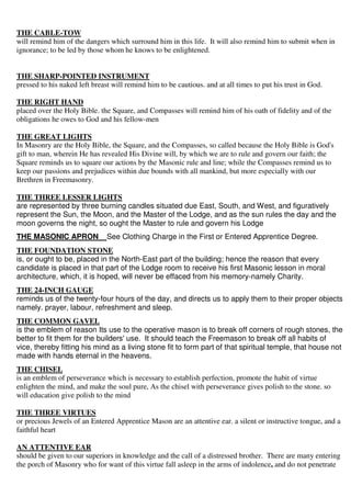This document provides summaries of Masonic emblems and their symbolic meanings according to Whitby's Ritual of Freemasonry. It describes emblems candidates encounter during initiation such as the hoodwink representing darkness and ignorance. It also summarizes furnishings of the Masonic lodge such as the Holy Bible, square and compasses representing morality, truth and wisdom. Various symbols are described including pillars, stairs, and tools representing virtues and lessons for bettering oneself through Masonic teachings.