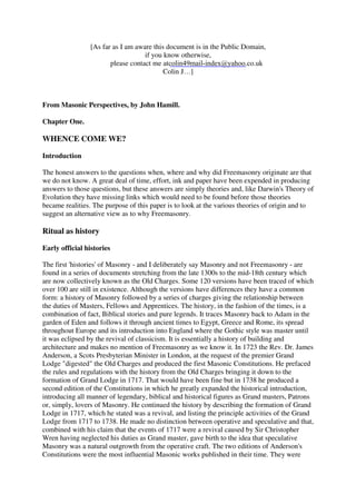 This document discusses various theories about the origins of Freemasonry. It summarizes that while early histories traced Masonry back to biblical figures, more recent research finds no direct evidence connecting operative stonemason guilds to the origins of speculative Freemasonry. Alternative theories proposed connections to the Knights Templar or Rosicrucians, but these are now largely discredited. The document explores evidence suggesting Freemasonry emerged separately in England and Scotland in the late 16th/early 17th century as a society for men of differing religious and political views to meet in harmony during a time of intolerance.