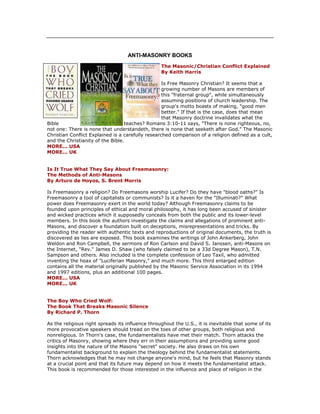 This document provides summaries of several books related to Freemasonry and secret societies. It begins with books that are critical of Freemasonry from a Christian perspective and argue it conflicts with biblical teachings. It then lists books that explore the history and origins of Freemasonry, examining theories about connections to the Knights Templar and its role in American history. Some titles delve into Freemason symbols and rituals. Conspiracy theories about Freemason influence are also addressed. The document serves as a guide to materials for researching Freemasonry from different perspectives.