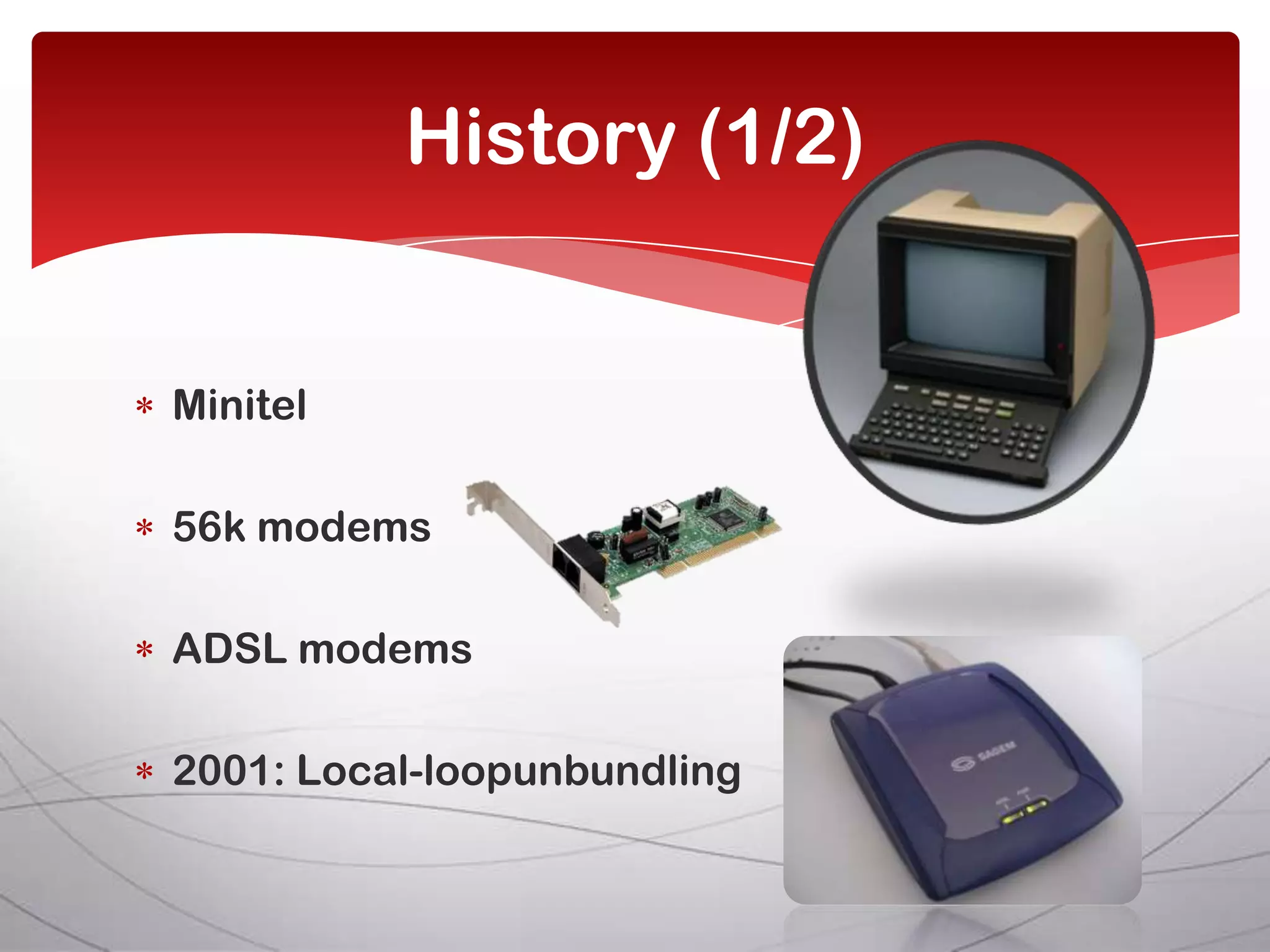 1) Minitel and 56k modems provided early internet access. ADSL modems then became popular in the early 2000s.