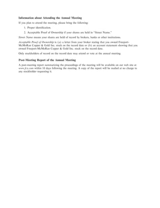 The document is a notice for Freeport-McMoRan Copper & Gold Inc.'s annual meeting of stockholders to be held on May 5, 2005. The purpose of the meeting is to elect nine directors, ratify the appointment of independent auditors, vote on a new annual incentive plan, and vote on two potential stockholder proposals. The record date for determining stockholders eligible to vote is March 9, 2005. Stockholders are encouraged to vote by proxy card whether or not they attend the meeting.