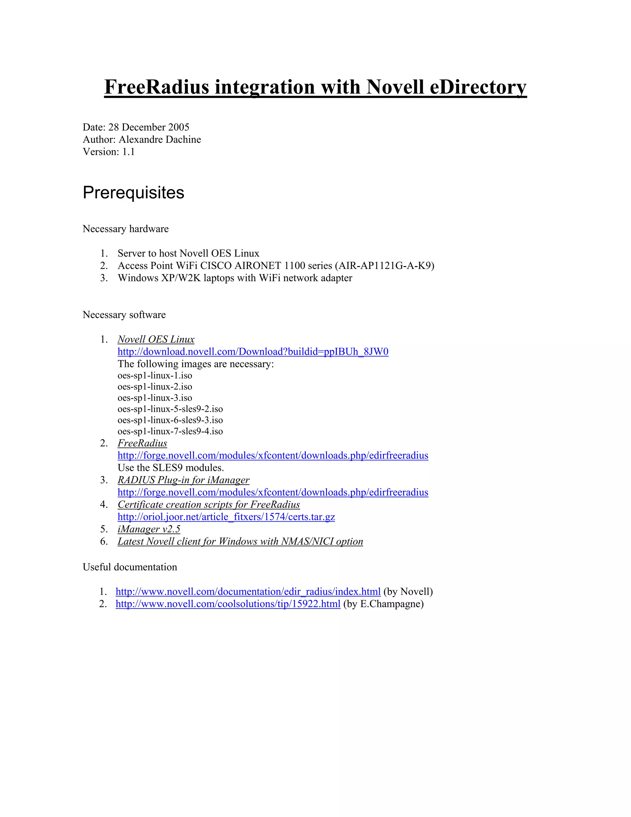 This document provides instructions for integrating FreeRadius with Novell eDirectory to enable wireless authentication. It describes installing and configuring Novell OES Linux, applying necessary patches, installing FreeRadius and the RADIUS plugin for iManager, extending the eDirectory schema, generating certificates, and configuring FreeRadius, eDirectory, and clients. The goal is to set up wireless authentication against an eDirectory user directory using FreeRadius as the RADIUS server.