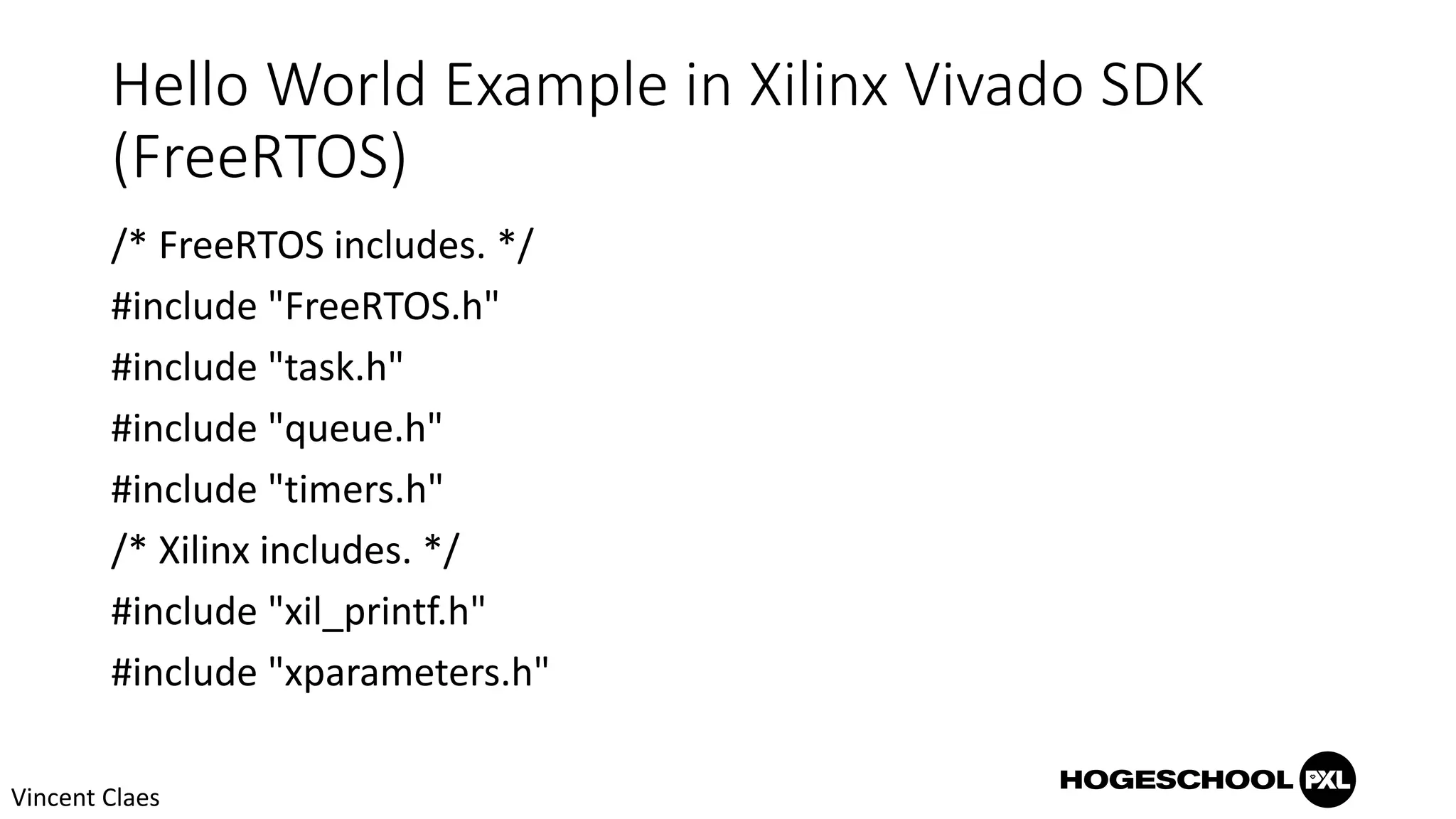 This document describes a "Hello World" example using FreeRTOS on an embedded operating system. It creates two tasks, a Tx task that sends the string "Hello World" to a queue every second, and an Rx task that receives the string from the queue and prints it. A timer is also created that expires after 10 seconds, checks if the Rx task has received enough messages, and prints whether the example passed or failed before deleting the two tasks.