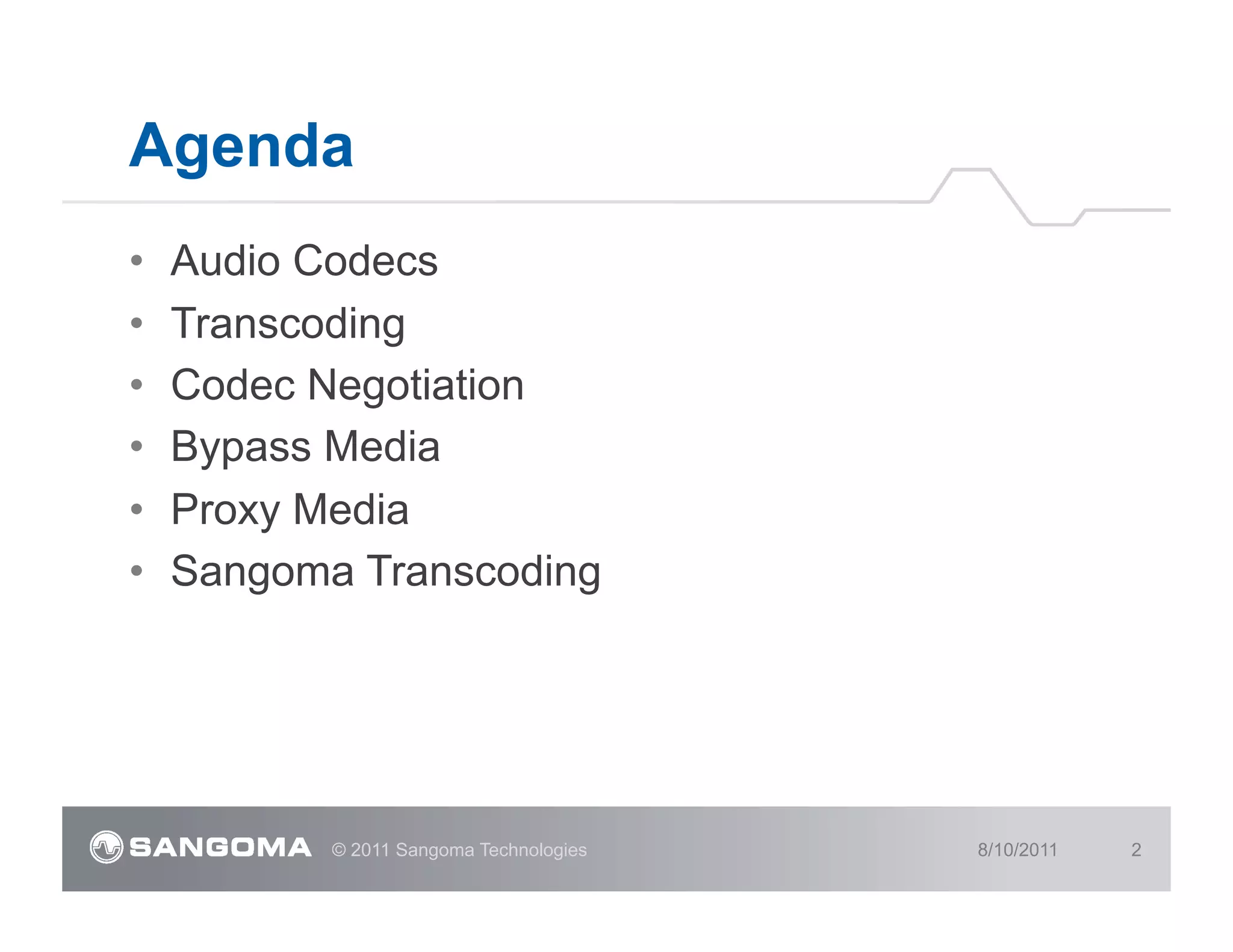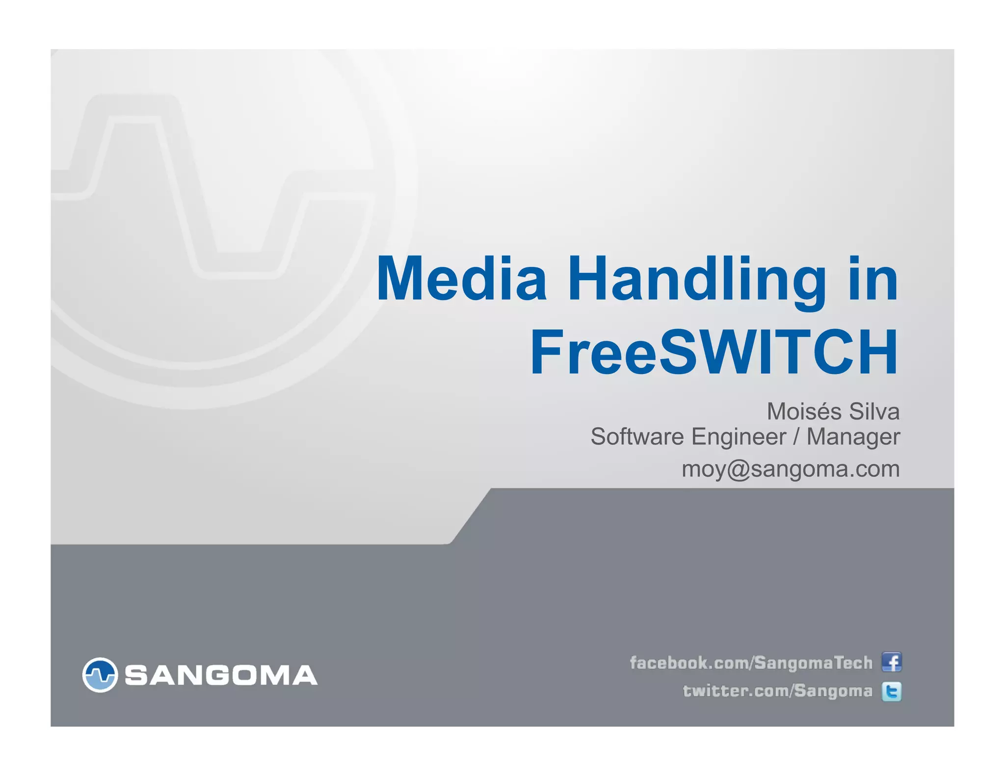 This document discusses media handling in FreeSWITCH. It covers topics like audio codecs, transcoding, codec negotiation, bypass media, proxy media, and Sangoma transcoding. The document provides details on common audio codecs supported by FreeSWITCH, how transcoding works in FreeSWITCH, codec negotiation algorithms, different media modes like bypass and proxy media, and Sangoma hardware transcoding cards. It aims to give an overview of key concepts around media and codecs in FreeSWITCH.