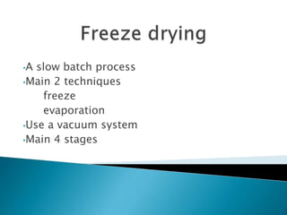 The document discusses the freeze evaporation dehydration process used for preserving materials and enhancing transportation efficiency, which involves four stages: pretreatment, freezing, primary drying, and secondary drying. It highlights the advantages and applications of this technique across various industries, including food processing, pharmaceuticals, and ceramics, while also addressing its limitations such as high costs and potential structural damage. The process is characterized by the sublimation of water and the controlled use of vacuum to optimize drying.