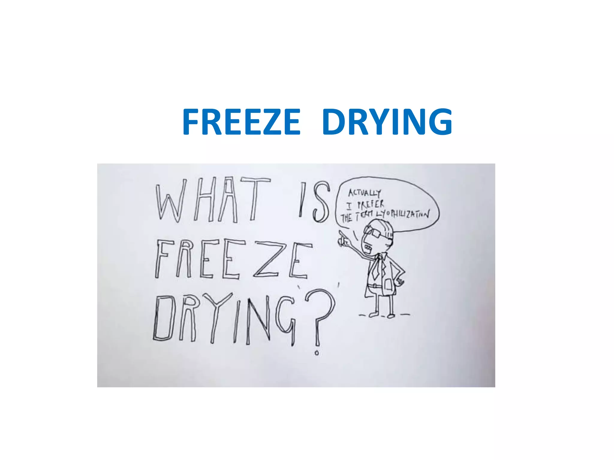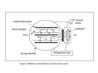 Freeze drying, also called lyophilization, is a process where material is frozen and then subjected to high vacuum pressure to sublime the frozen water in the form of vapor. It involves pretreating the product, freezing it, primary drying where ice sublimes under low pressure and heat, and secondary drying to remove remaining unfrozen water. Freeze drying retains most of the food's structure, flavor, and nutrients and produces a lightweight product with a long shelf life.