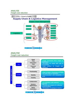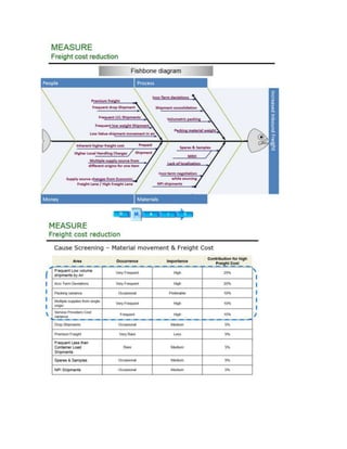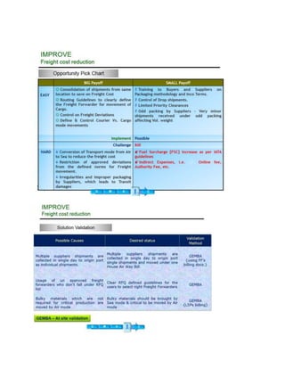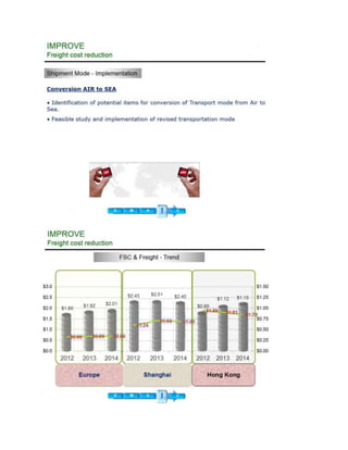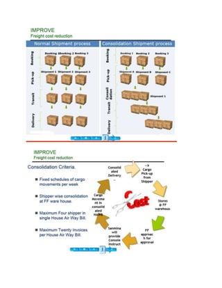 This document summarizes a freight cost reduction project. It states that the project achieved $646,758 in annual savings for the client by renegotiating carrier contracts and establishing standard operating procedures to ensure quality requirements were met. The project aimed to reduce the inbound freight ratio and average spend from $2.9 to $2.0 per kg as freight costs were increasing due to fuel, freight, and service charge hikes. A cross-functional team contributed to making the project a success.