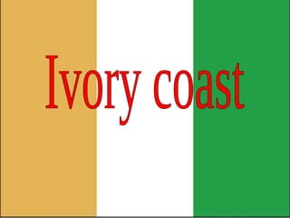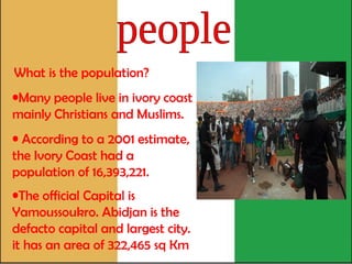 The Ivory Coast has a population of over 16 million people who are primarily Christian or Muslim. The capital is Yamoussoukro, though Abidjan is the largest city. One of the country's most famous festivals is the Festival of Masks in November where masks are used in dances to honor forest spirits. Major cities include Bouaké, Daloa, Korgho, and Yamoussoukro. The country's flag uses the colors orange, white, and green based on the French flag. Popular tourist attractions are Yamoussoukro's market and buildings like the Presidential Palace as well as the Basilique de Notre Dame de la Paix basilica.