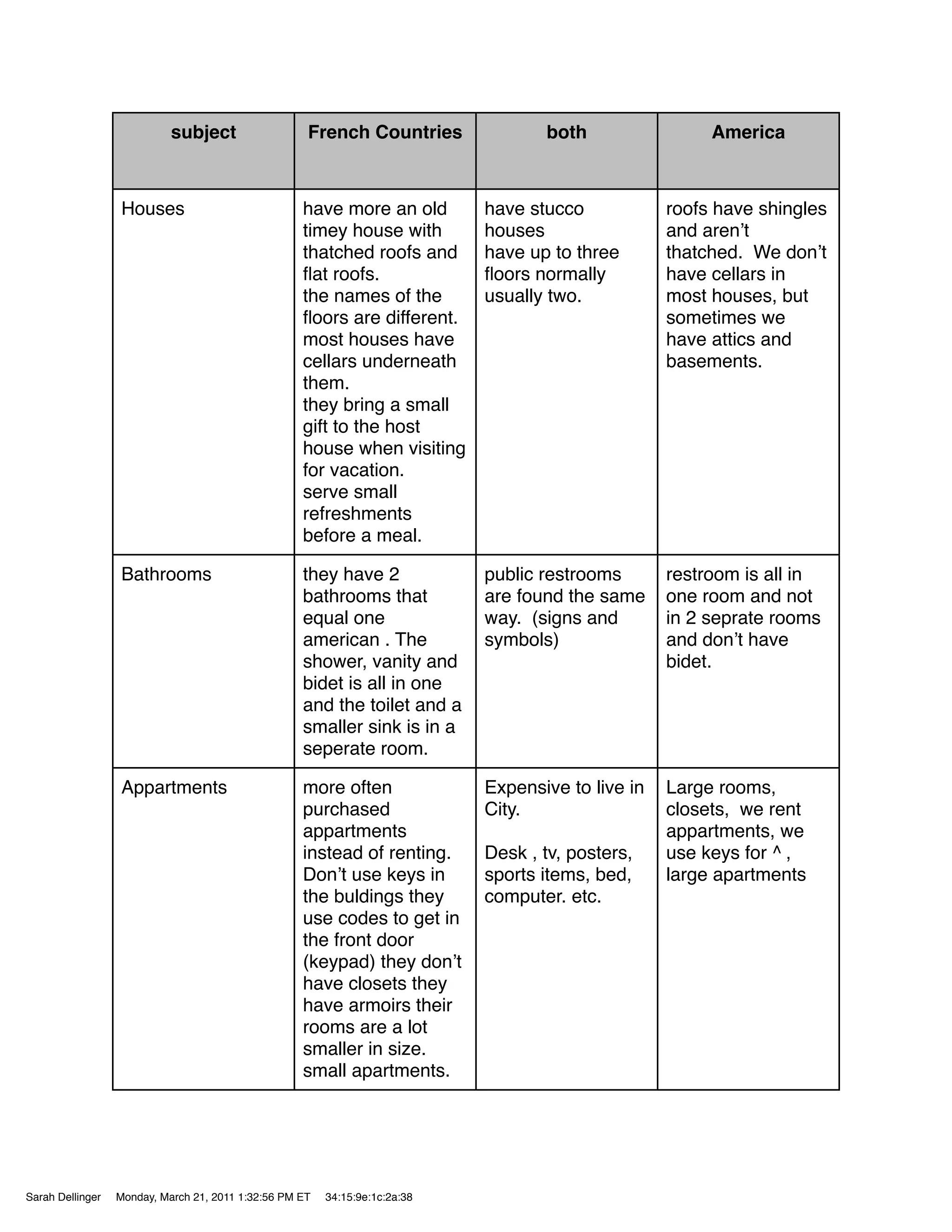 French houses tend to be older with thatched roofs, flat roofs, and cellars, while American houses have shingled roofs and no cellars. Bathrooms in French houses combine the shower, vanity and bidet in one room while separating the toilet in another smaller room, unlike American single-room bathrooms. French residents also commonly live in apartments instead of houses, accessing buildings with codes instead of keys and having smaller room sizes than American apartments. House sizes vary between countries, with big French cities having large homes and small cities smaller homes, unlike America where big cities have smaller homes.