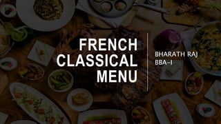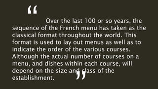 The document outlines the classical French menu format, detailing the sequence and types of courses typically served in upscale dining. It includes a comprehensive breakdown of each course from hors-d'œuvre to boissons, along with accompaniments and table setups for various dishes. The content emphasizes the culinary structure and presentation practices that define French classical cuisine.