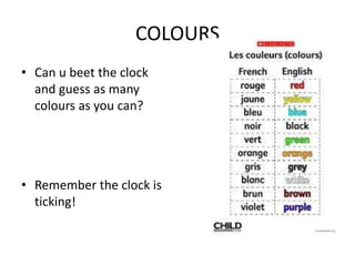 This document lists common colors in both English and French and challenges the reader to name as many as they can within a time limit. It then provides the answers in both languages, including red, yellow, blue, black, green, orange, grey, white, brown, and purple in English and their French translations of rouge, jaune, bleu, noir, vert, orange, gris, blanc, marron, and violet.