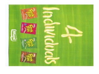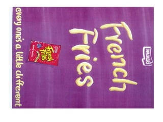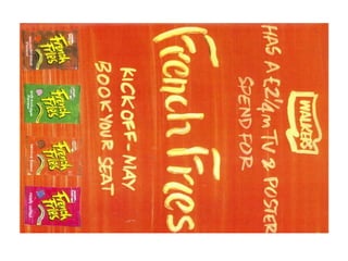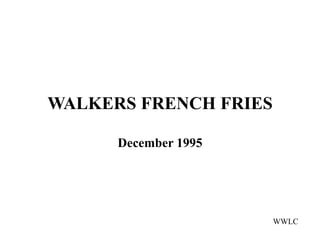 This document discusses marketing strategies for Walkers French Fries snack product. It analyzes the snack market, target demographics of 11-15 year olds and their mothers, and competitive brands. The strategy is to position French Fries as an at-home snack for kids, targeting both kids to build brand identity and mothers to influence purchase. A TV, outdoor, and print advertising campaign from April to December 1996 will launch nationally with heavier placement in midlands regions.