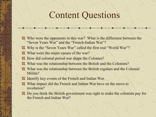 The document provides background information on the French and Indian War (1754-1763), which was a colonial conflict between France and Britain in North America that was part of a larger imperial war between the two powers called the Seven Years' War. It discusses key events that led to the start of the war such as territorial disputes in the Ohio River Valley and George Washington's involvement at Fort Necessity. It also summarizes several major battles during the war including General Braddock's defeat at Fort Duquesne and the massacre of British soldiers at Fort William Henry.