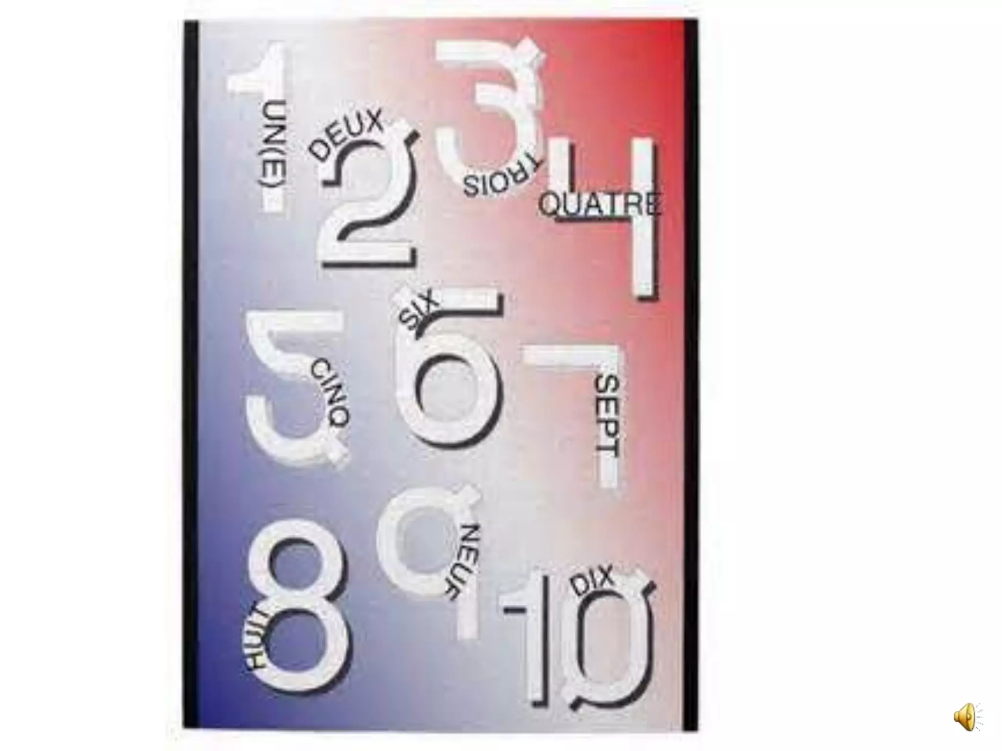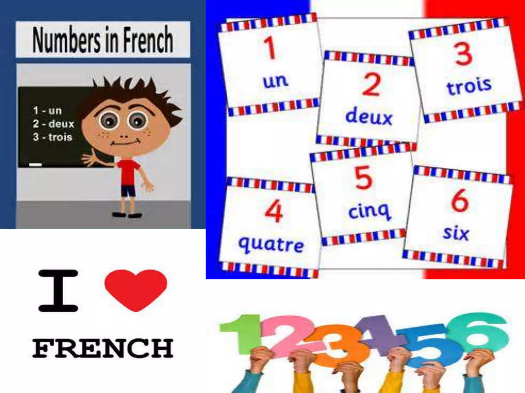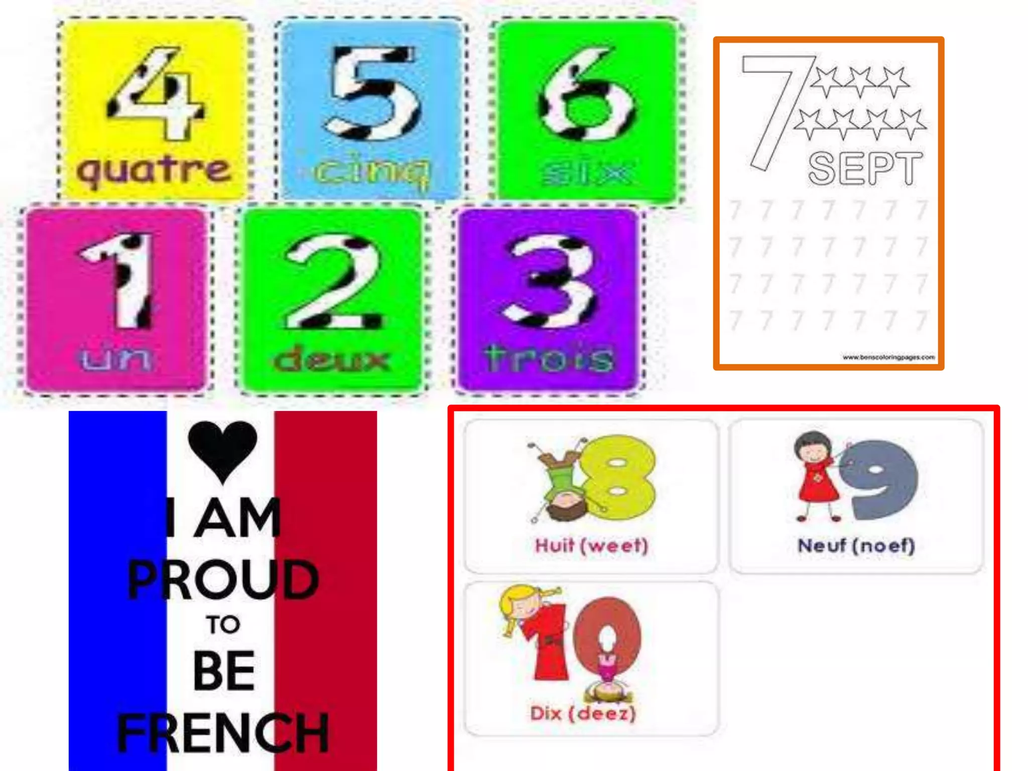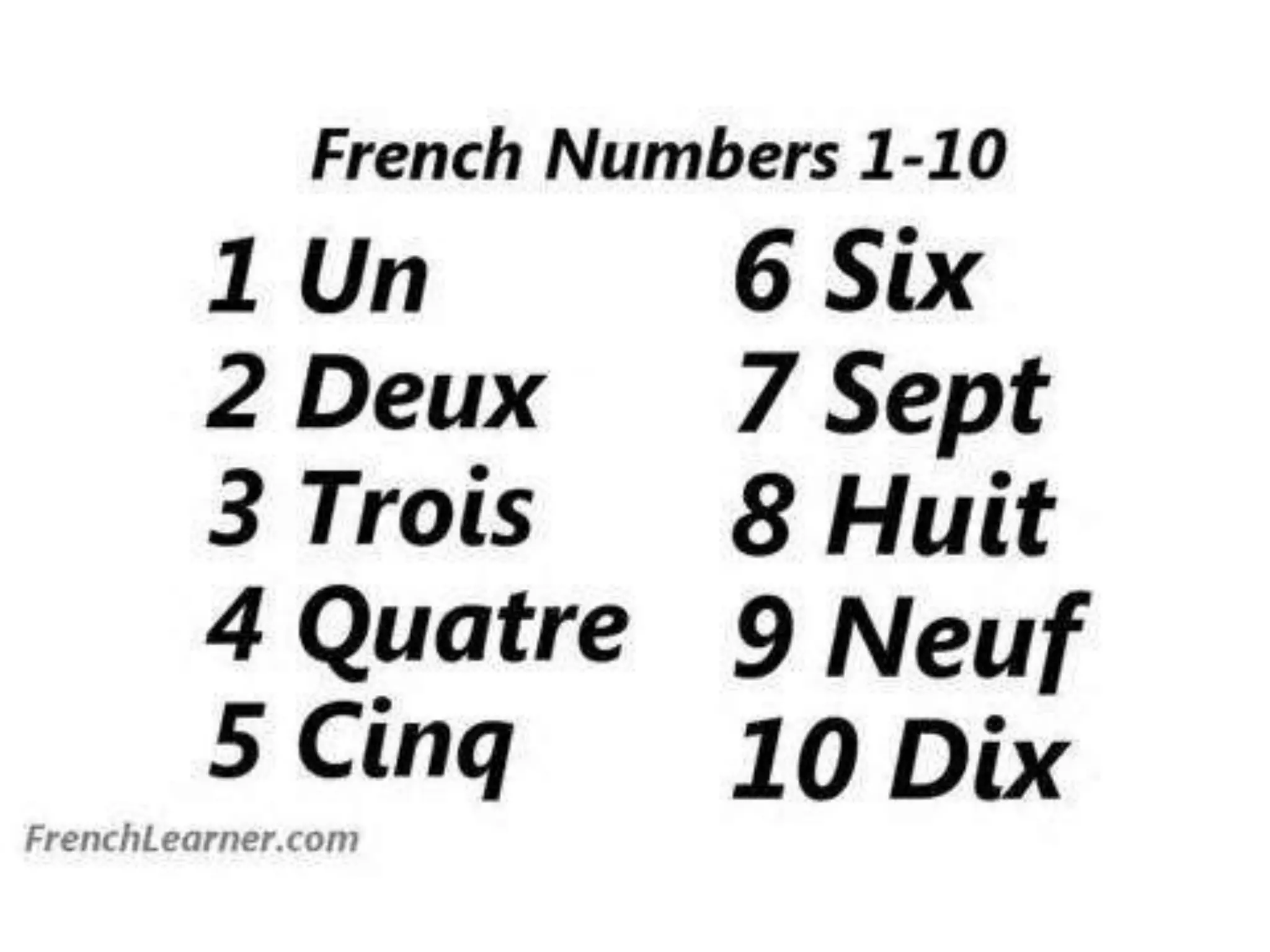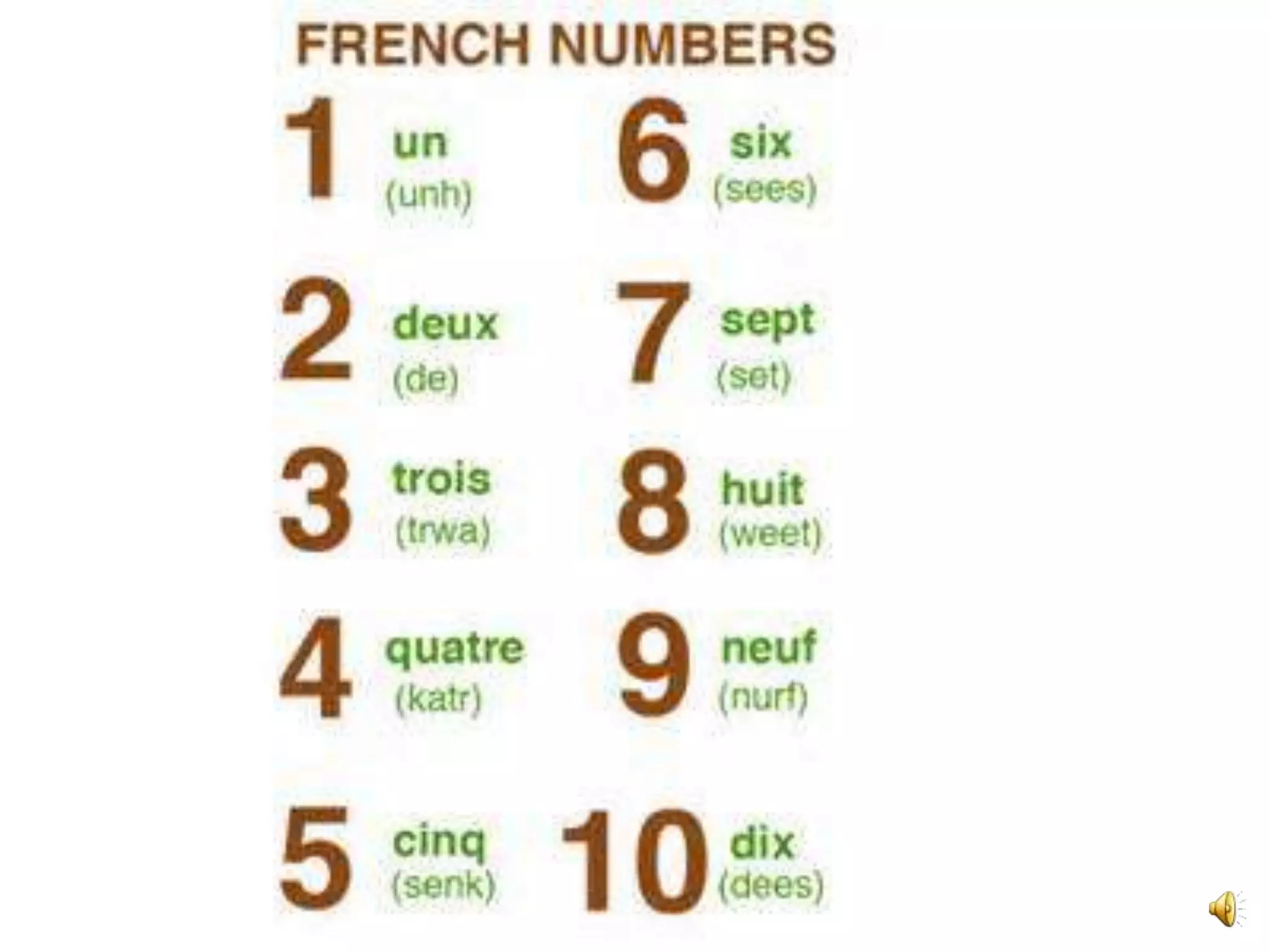 French numbers 1 through 10 are: 1. un 2. deux 3. trois 4. quatre 5. cinq 6. six 7. sept 8. huit 9. neuf 10. dix The document provides French numbers 1 through 10 and recommends several YouTube videos for learning and practicing counting in French.